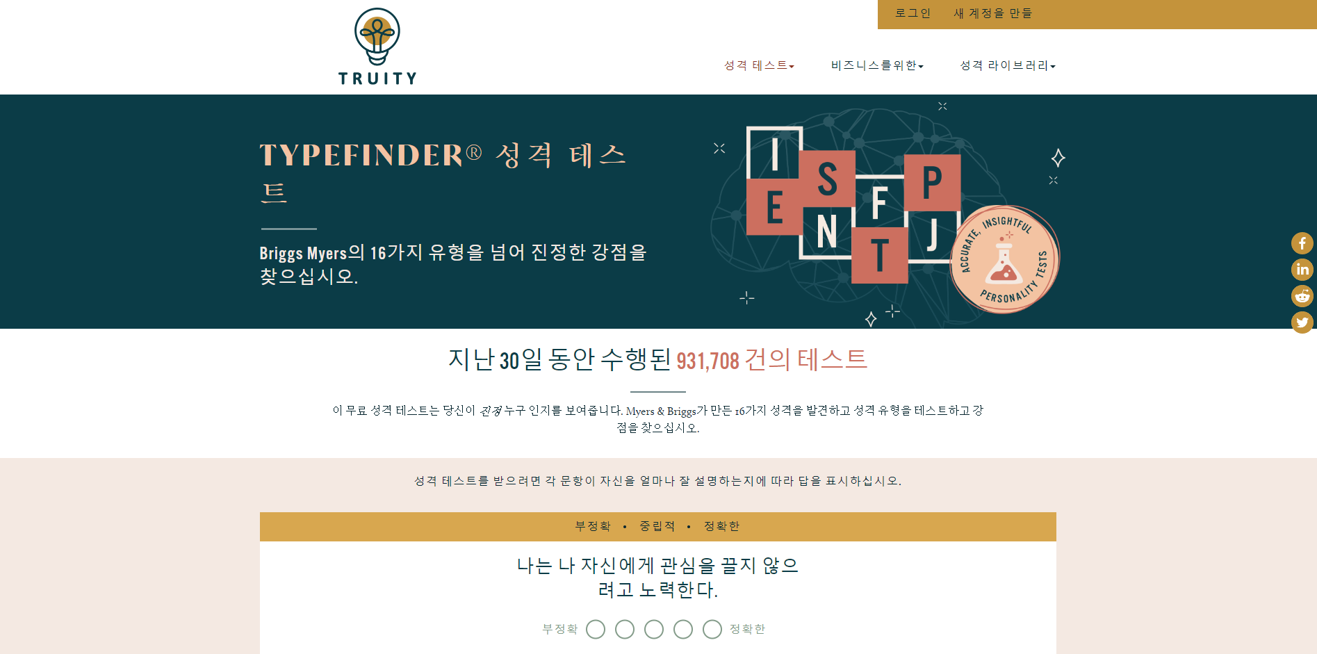 Truity는 간단한 44문항의 MBTI 테스트를 제공하는 사이트입니다. 테스트 후, 자세한 결과와 MBTI 유형 프로필을 확인할 수 있습니다.