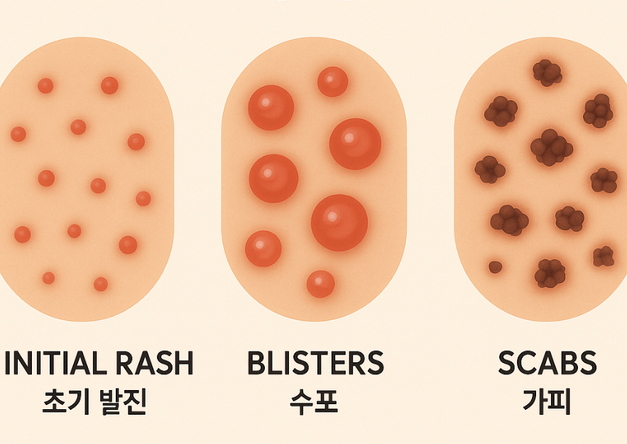 - 딱지 형성: 시간이 지나면서 물집은 터지거나 쭈그러들고 딱지(가피)로 변합니다. 수두는 새로운 발진이 계속 생겨나는 특징이 있어, 딱지와 물집, 붉은 반점이 한 몸에 동시에 관찰되는 경우가 많습니다.