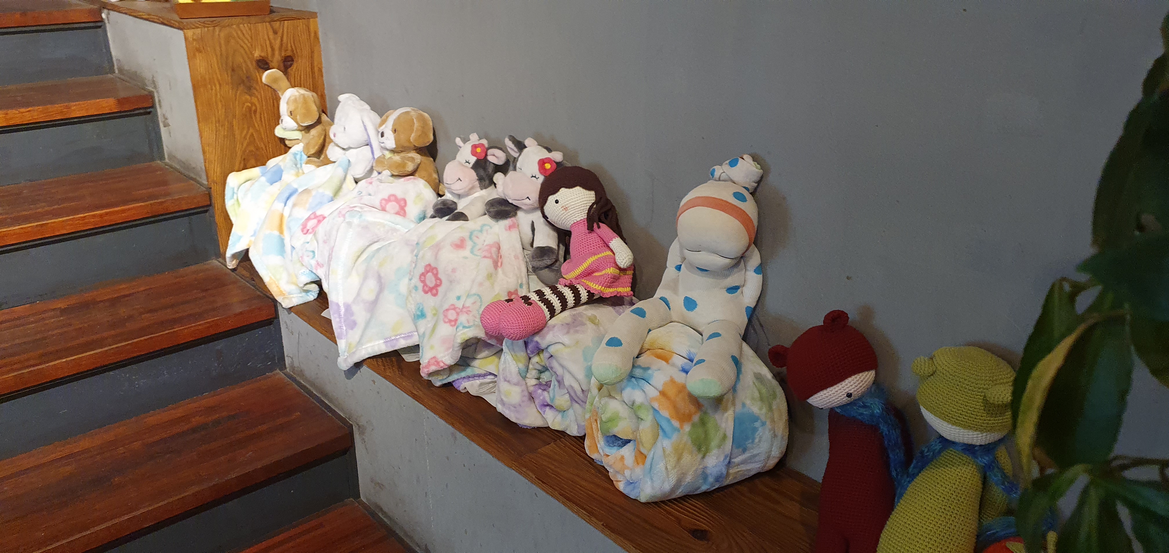 삼청동 루프탑 카페 골목숲 1층에서 2층으로 가는 계단 옆에는 귀여운 인형과 담요가 보였습니다.